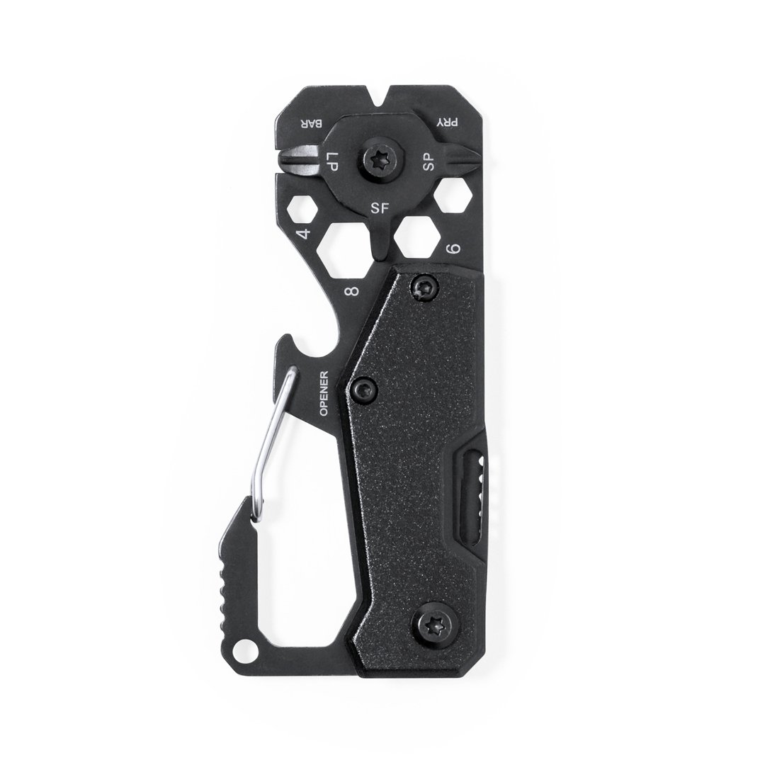 Excellent multioutil fabriqué en aluminium et en acier inox avec finition noire. Il comprend 13 fonctions différentes : clé pour écrous hexagonaux de différentes tailles, mousqueton, ouvre-boîte, règle, raquette, couteau, tournevis plats et cruciformes. Présenté dans une boîte design kraft.