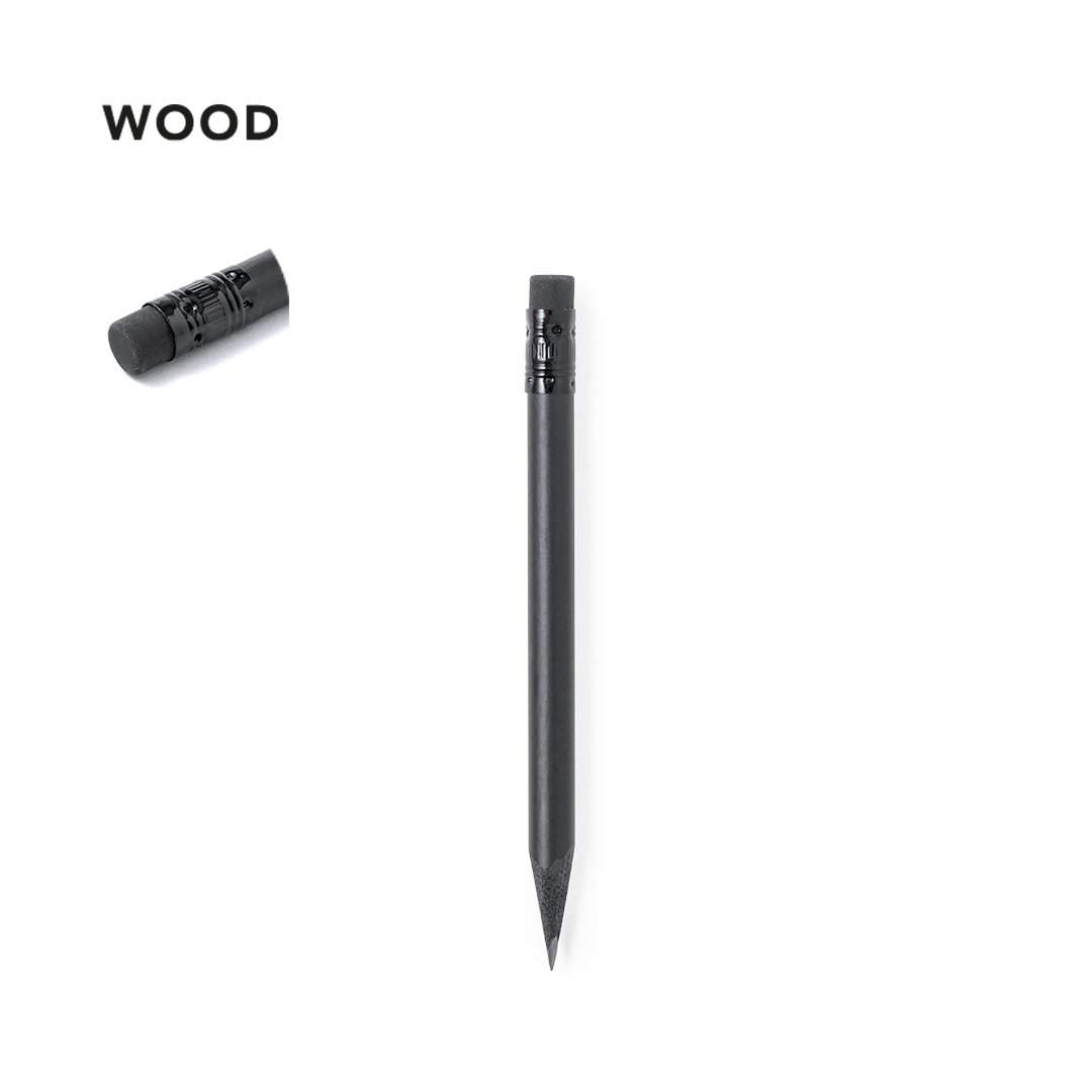 Crayon en bois naturel finition noir mat, avec mine noire, pointe pointue et gomme sur le dessus correspondant.
