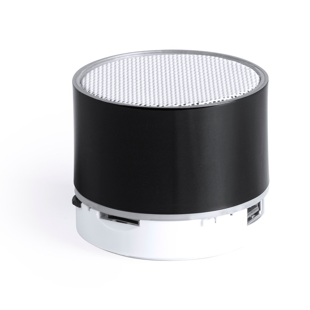 Enceinte Bluetooth® compacte, logo lumineux. Surface extérieure spécialement conçue pour la gravure laser, logo luminueux. Design bicolore avec finition brillante et connexion Bluetooth 3.0, puissance de 3 W, fonction mains libres, emplacement pour cartes micro SD jusqu à 32 Go, fonction radio FM, entrée ligne auxiliaire via prise jack 3,5 mm et des supports en caoutchouc antidérapants sur la base. Compatible avec iOS et Android, comprend un mini câble de chargement USB, un câble jack auxiliaire de 3,5 mm, base antidérapante. Il est livré dans un boiter design.