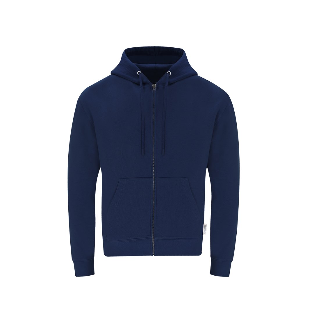 Sweat à capuche zippé unisexe en coton biologique et polyester recyclé, en molleton doux de 280 g/m². Avec capuche doublée à double épaisseur, cordons de serrage ronds ajustables – avec embouts assortis – et œillets métalliques. Poignets et bas en tricot côtelé élasthanne, et poche kangourou sur le devant. Ouverture zippée métallique cachée, avec couture renforcée sur le col. Inclus étiquette écologique distinctive.