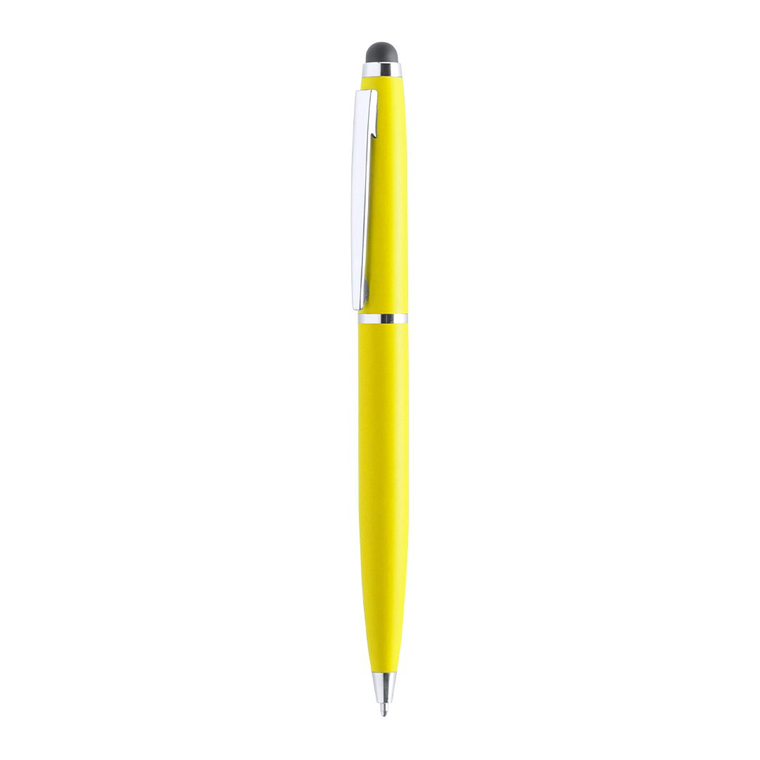 Stylo stylet à mécanisme rotatif avec corps métallique lisse et couleurs gaies. Attributs et bagues coloris argent. Encre bleue.