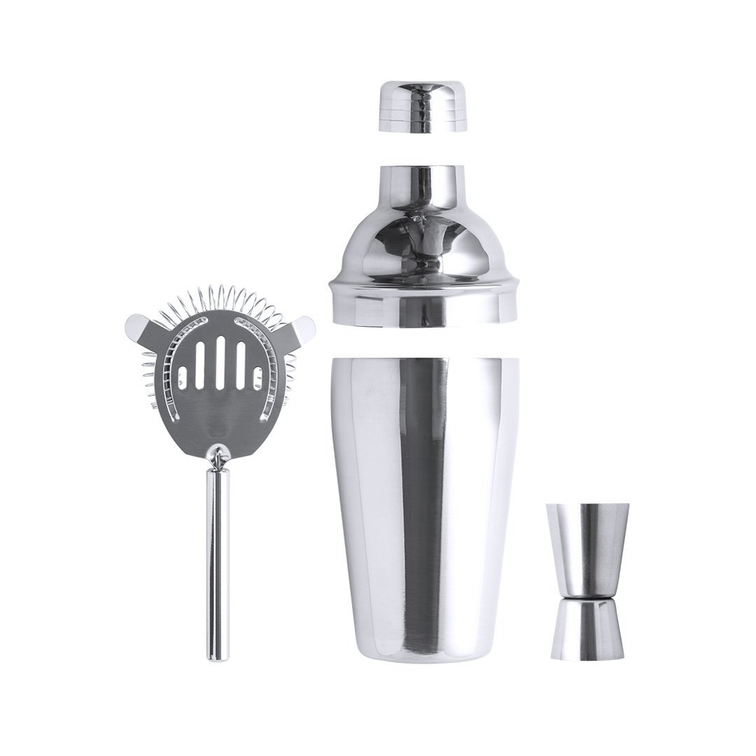 Ensemble cocktail avec 3 accessoires, en acier inoxydable avec une finition chromée. Il comprend:Shaker à cocktail dune capacité de 550 ml, avec fermeture de sécurité et bouchon distributeur sur le dessus.Passoire avec poignée.Compteur simple / double.