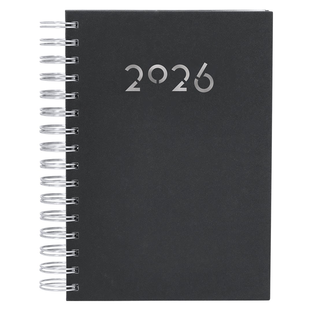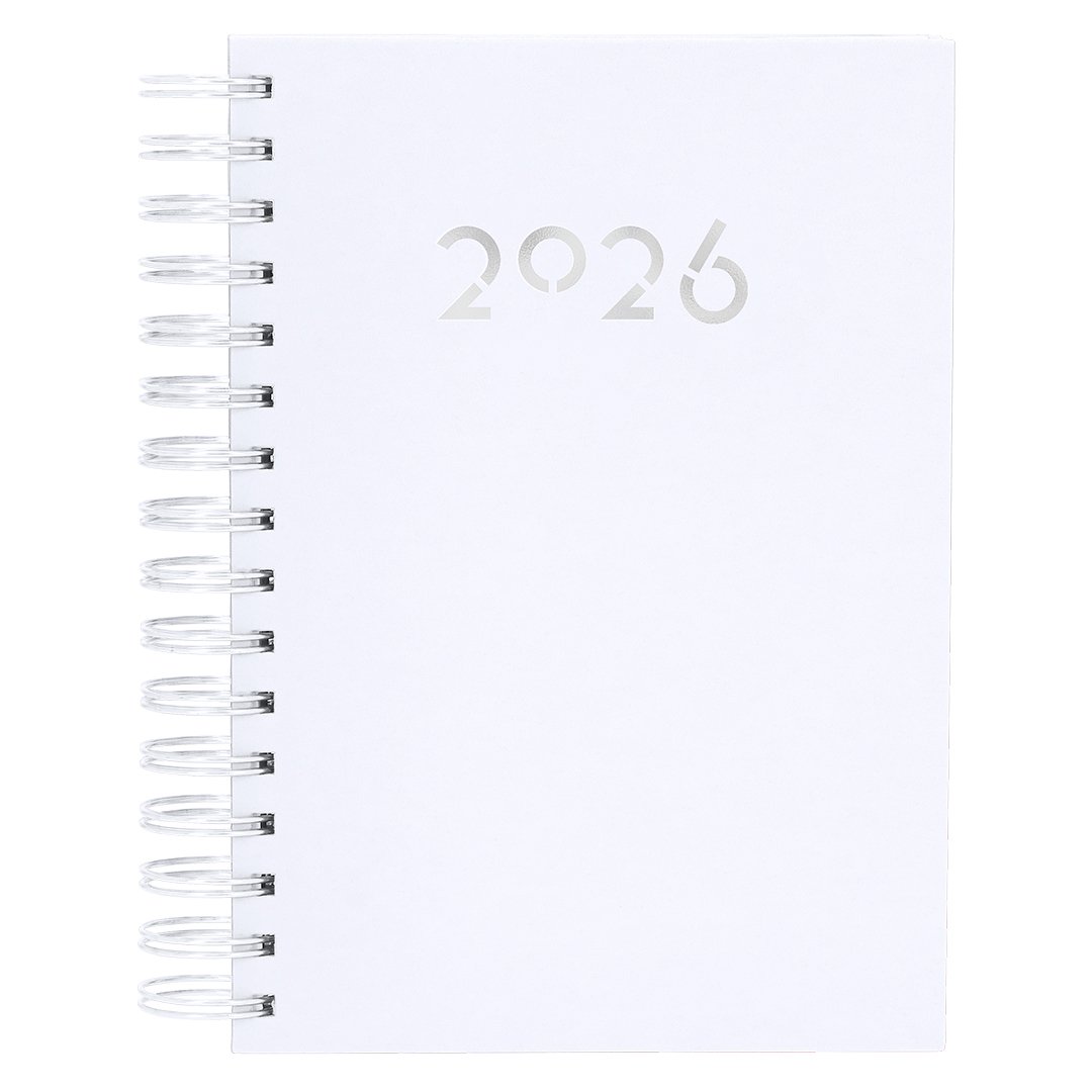 Agenda à anneaux format A5 en cuir PU doux et résistant, avec couvertures rigides. Inclus une boîte de présentation en kraft.Design page par jour et pages avec coin découpé. En 2 langues : espagnol et anglais.