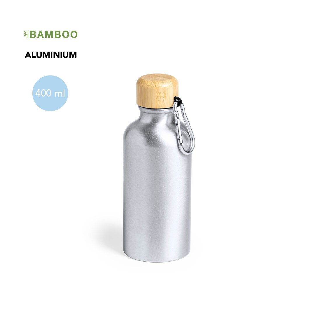 Gourde de la ligne Nature et capacité de 400 ml. Corps en aluminium finition mate et capuchon en bambou avec mousqueton assorti pour un transport facile. Sans BPA et présenté dans une jolie boîte éco design.