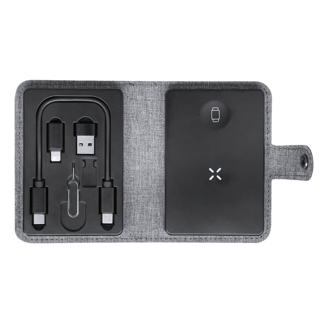 Station de charge complète en 300D RPET. Boîtier compact avec fermeture à bouton et incluant une station de charge sans fil Qi pour smartphones, écouteurs et montres connectées. Fournie avec un câble de connexion Type-C à chaque extrémité, plus des adaptateurs USB et lightning/micro USB. L’ensemble est complété par un éjecteur de carte SIM et un compartiment pour stocker une carte Micro SIM. Avec logo RPET.Le matériau RPET est fabriqué à partir de plastique recyclé, favorisant ainsi la réutilisation des déchets plastiques et contribuant à la durabilité de la planète.