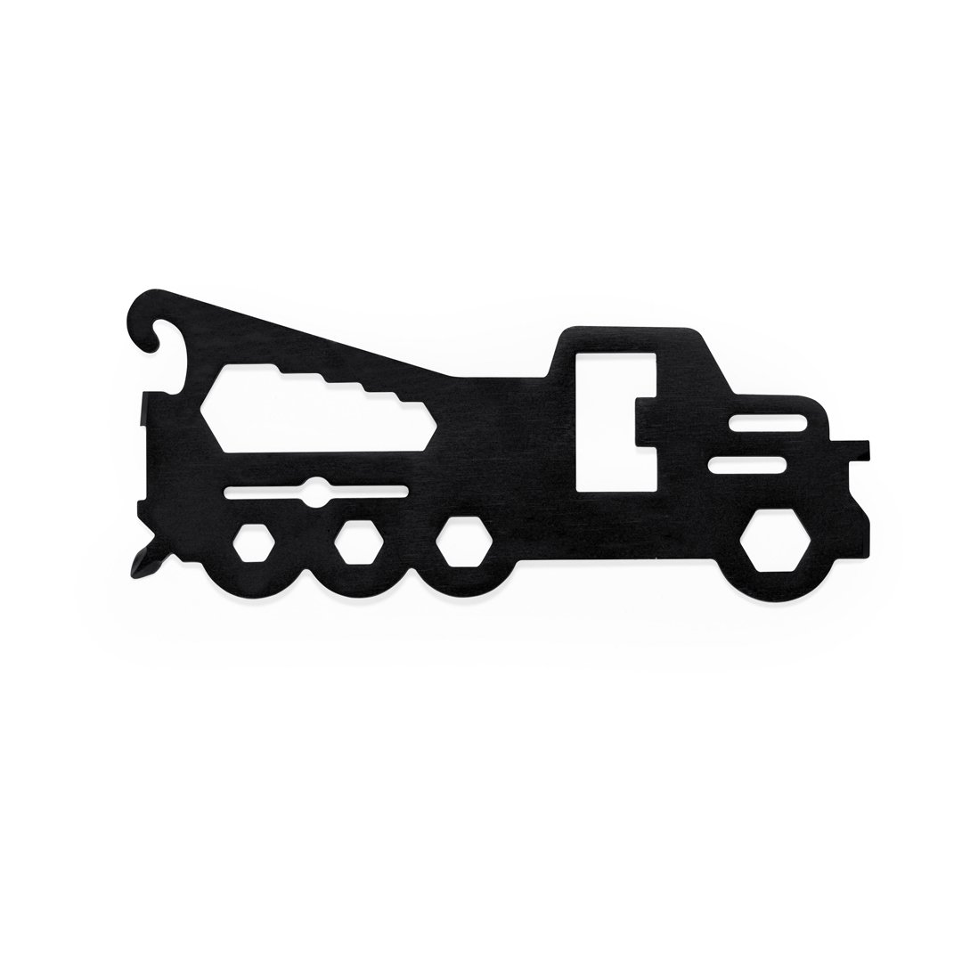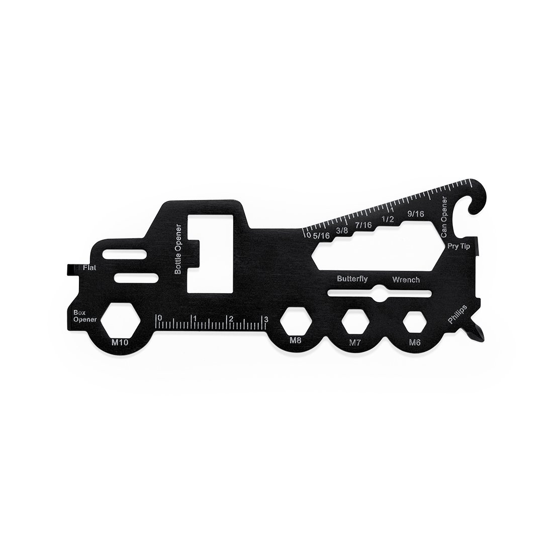 Original et pratique multi-outils en acier inox en forme de camion. Avec 18 fonctions, entre autres : tournevis à bout plat et Philips, clé pour écrous hexagonaux en différentes tailles, règle, ouvre-boîte et ouvre-bouteille. Présenté dans un sac en papier recyclé.